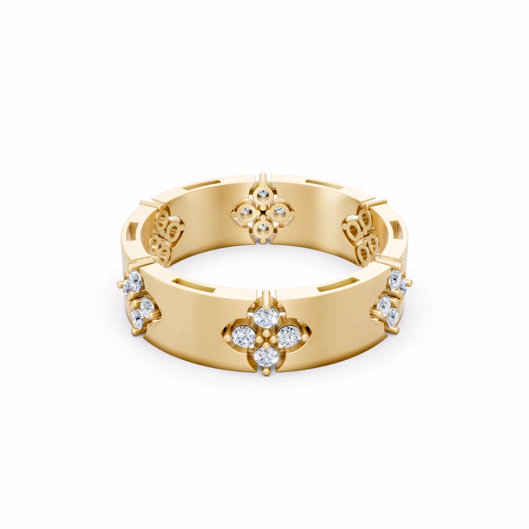 Elevate your jewelry collection with our stunning Clover Band Ring. This modern eternity band is designed with architectural rectangular links interspersed with delicate, diamond-set four-petal motifs. Whether you wear it as a standalone piece or the centerpiece of your stack, this Clover Band Ring offers a perfect balance of bold structure and feminine grace. Crafted in premium 18k gold or silver, the Clover Band Ring is built for a lifetime of brilliance. This Clover Band Ring is the ultimate gift of luck and luxury.