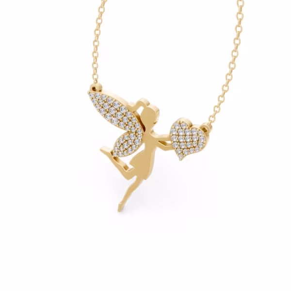 Ignite the magic with our Fairy Heart Necklace, inspired by whimsical architectural design. Crafted in 18k Gold or Silver finish, it features a pavé-set fairy silhouette clutching a sparkling diamond heart. A refined yet powerful piece designed for everyday wear and modern elegance, this Fairy Heart Necklace serves as a luxury staple for every dreamer.