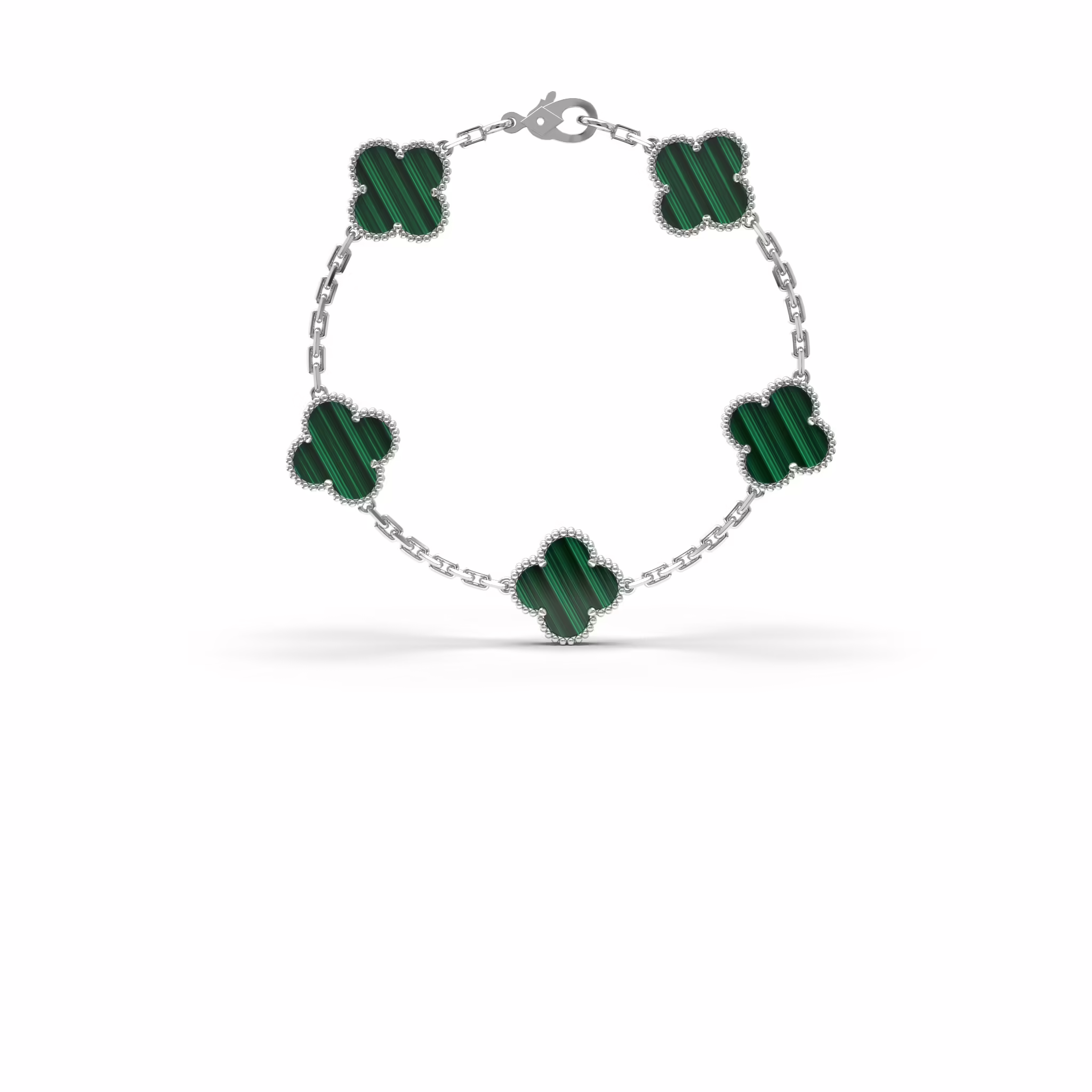 Malachite VanCleef Bracelet is a luxury green gemstone jewelry, iconic Alhambra design, timeless elegance, handcrafted for style and sophistication.