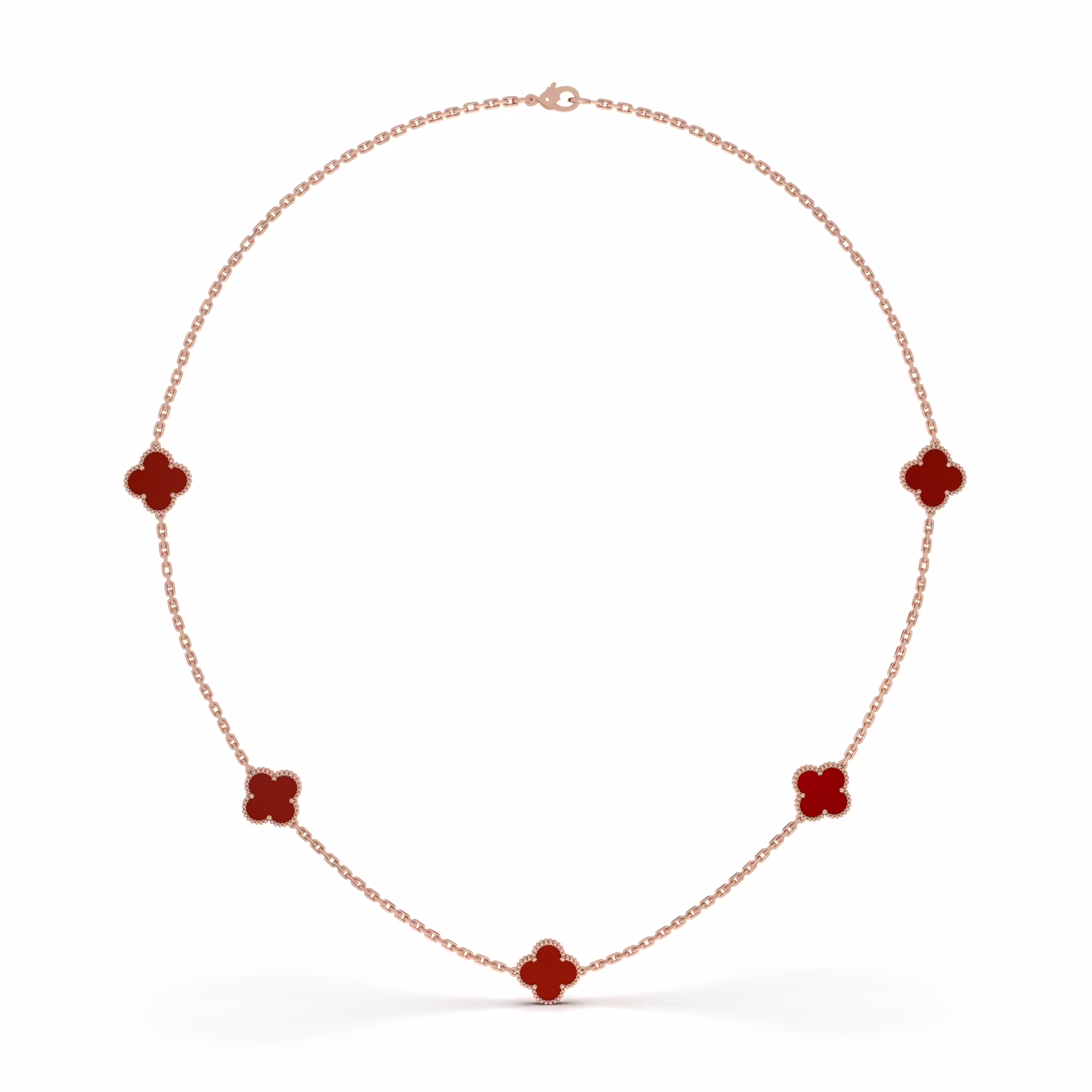 Van Cleef & Arpels Red Carnelian Clover Necklace in signature Alhambra design. A striking blend of timeless elegance and rich gemstone luxury.