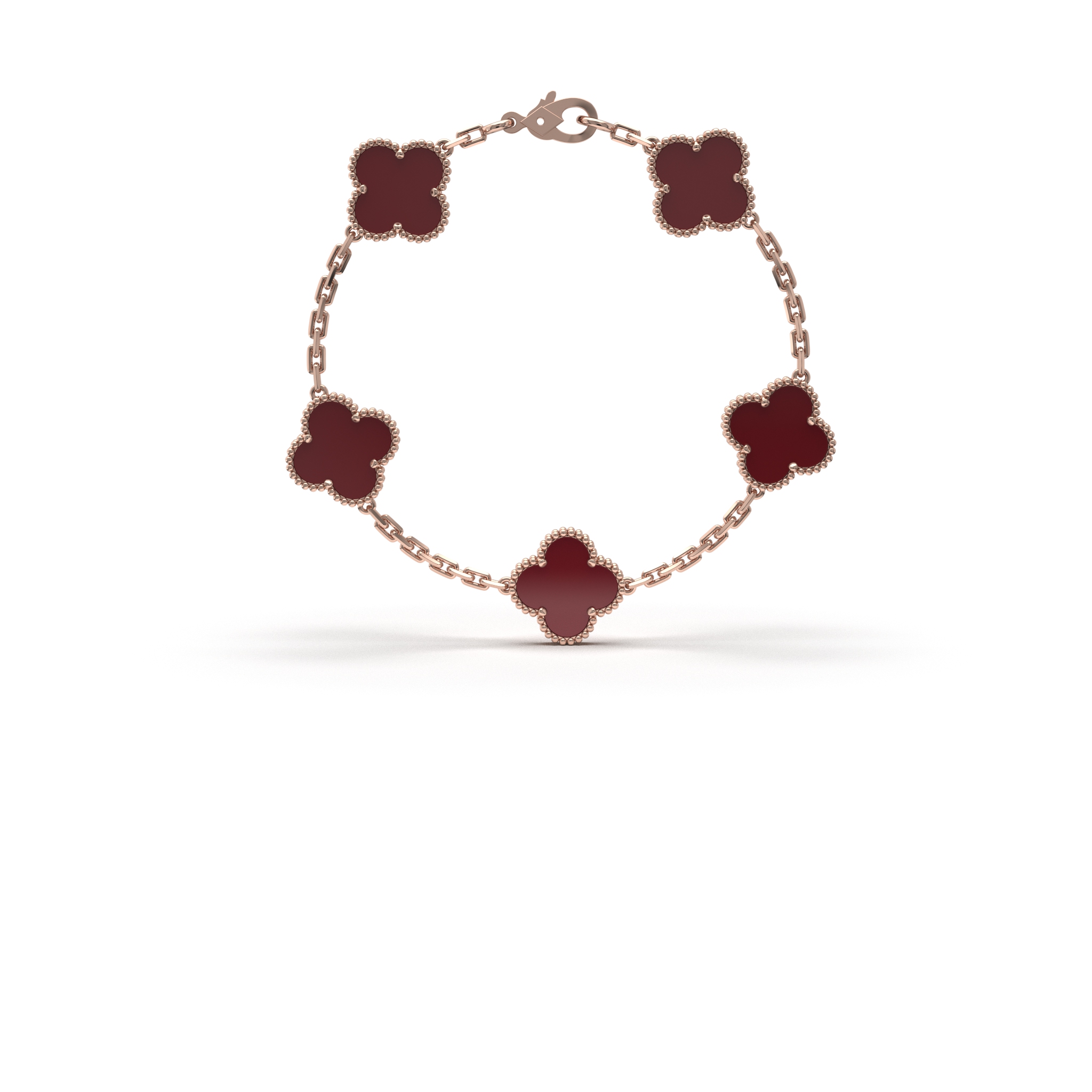 Radiate warmth with the Red Carnelian VanCleef bracelet. This iconic Alhambra design meets fiery elegance. A timeless touch of luxury.